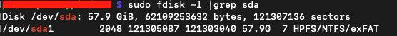 저의 경우 NTFS방식이기 때문에 ntfs로 작성했고, 다른 경우에는 다른 명령어를 사용합니다.
