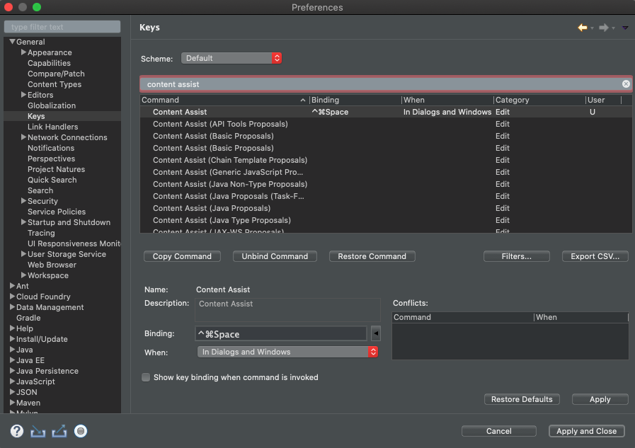 그래서 Spotlight 단축기를 변경하고 이클립스에서 자동완성 기능 단축기를 [Control + Space]로 할까도 생각했지만 기본 설정을 최대한 그대로 두는 걸 좋아해서 자동완성 단축기를 다른 키로 설정하기로 했습니다.