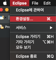 이클립스 실행한 상태에서 상단 좌측에 [Eclipse] > [환경설정]으로 들어갑니다.