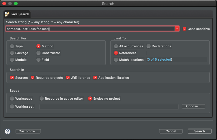 함수 최초 생성된 위치( public void fncTest() )에서 [fncTest] 부분만 선택한 후 단축기를 사용하여 검색창을 열어봅니다.