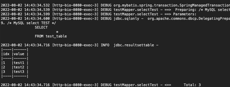 2022-08-02 15:35:43.191 [http-bio-8080-exec-24] DEBUG testMapper.selectTest - <== Total: 3