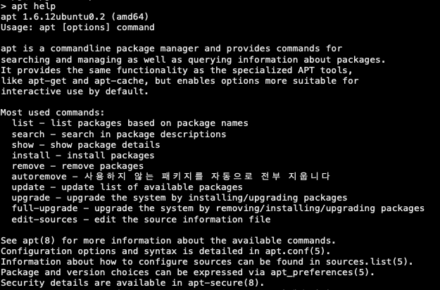 그 외 apt의 다양한 사용법은 위 명령어를 통해 확인할 수 있습니다.