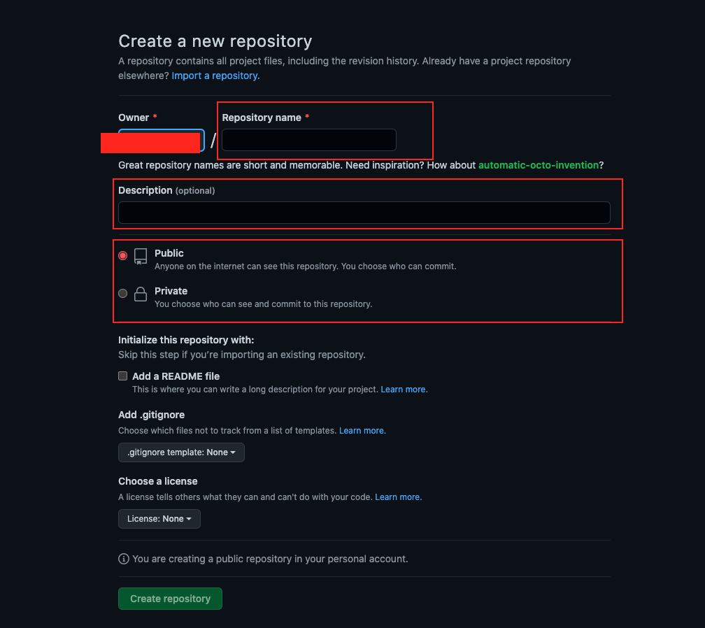 내가 생성할 Repository 이름과 설명을 작성합니다.
