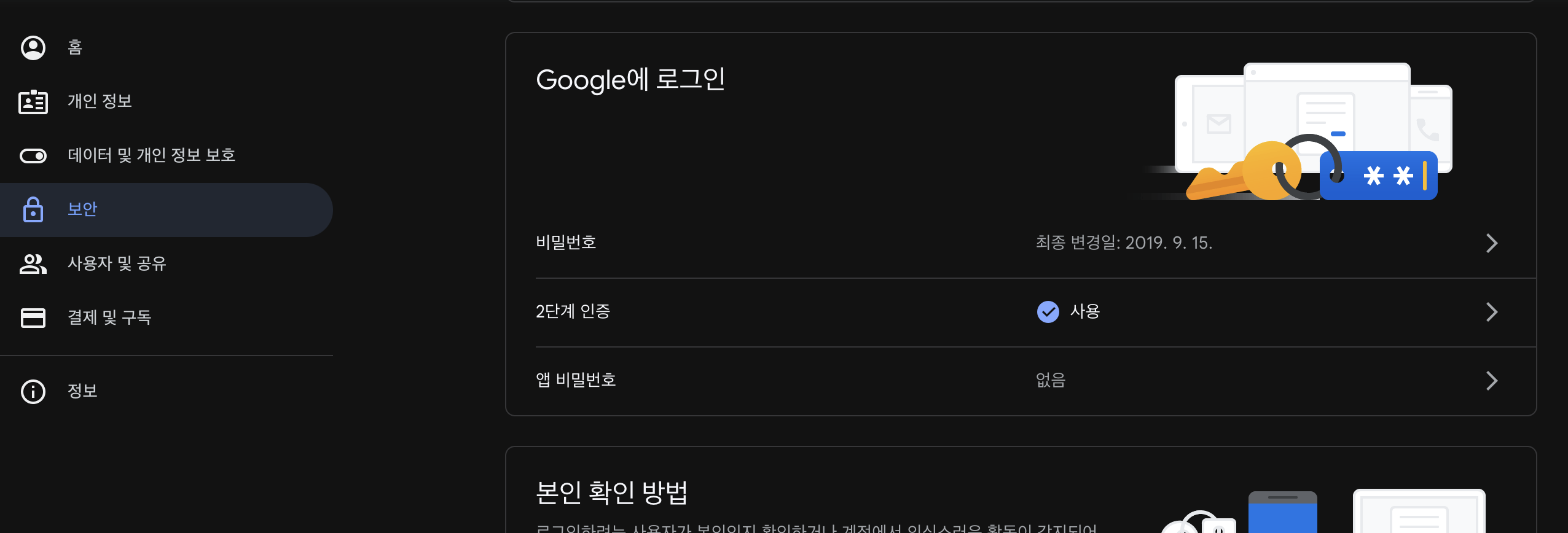 왼쪽 보안 탭에서 Google에 로그인 쪽에서 2단계 인증을 먼저 진행합니다.